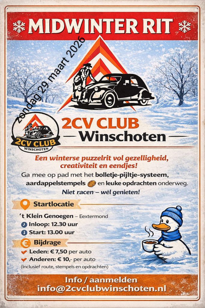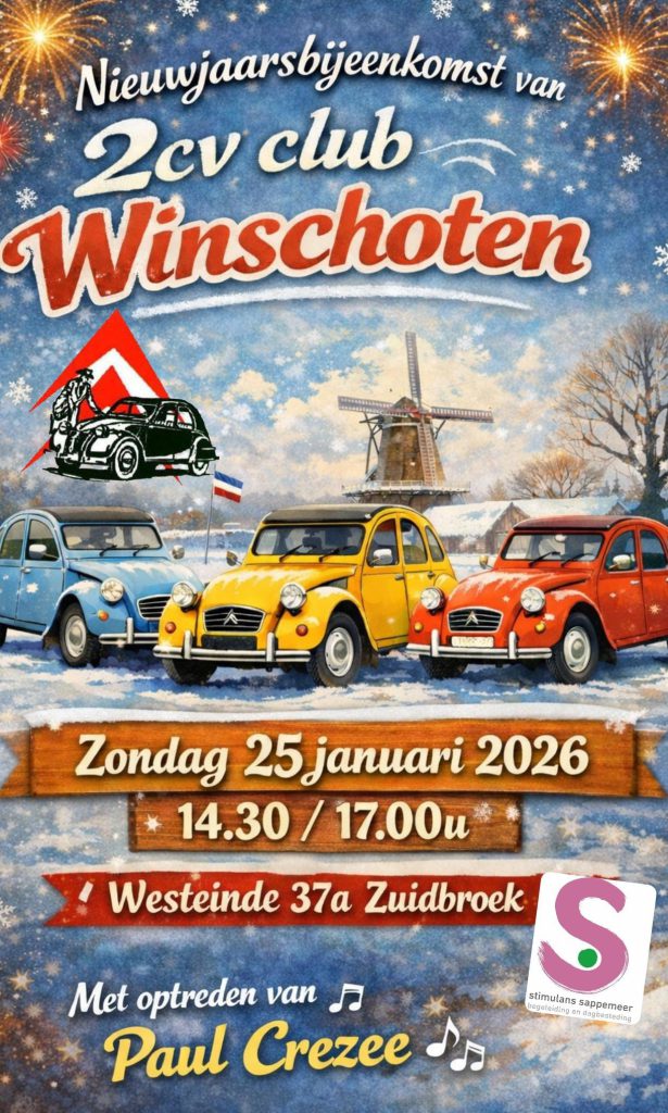 2CV Club Winschoten Nieuws Nieuwjaarsbijeenkomst 25 januari 2026 2 januari 2026 Snertrit 23 November 2025 2 oktober 2025 Nachtrit 11 Oktober 2025 2 oktober 2025 200 Jaar stad Winschoten + foto’s 27 september 2025 Agenda Nieuwjaarsbijeenkomst 25 januari 2026 Snertrit 23 November 2025 Nachtrit 11 Oktober 2025 Citroën Cars & Coffee 30 augustus 2025 Beste Citroën-vrienden, Op 30 augustus is het zover. Dan vindt de eerste Citroën Cars & Coffee plaats, in samenwerking met… Read More.. Driekwart rit 21 september 2025 + Foto’s K(r)ampeertreffen 4-5-6 juli 2025 FacebookInstagram